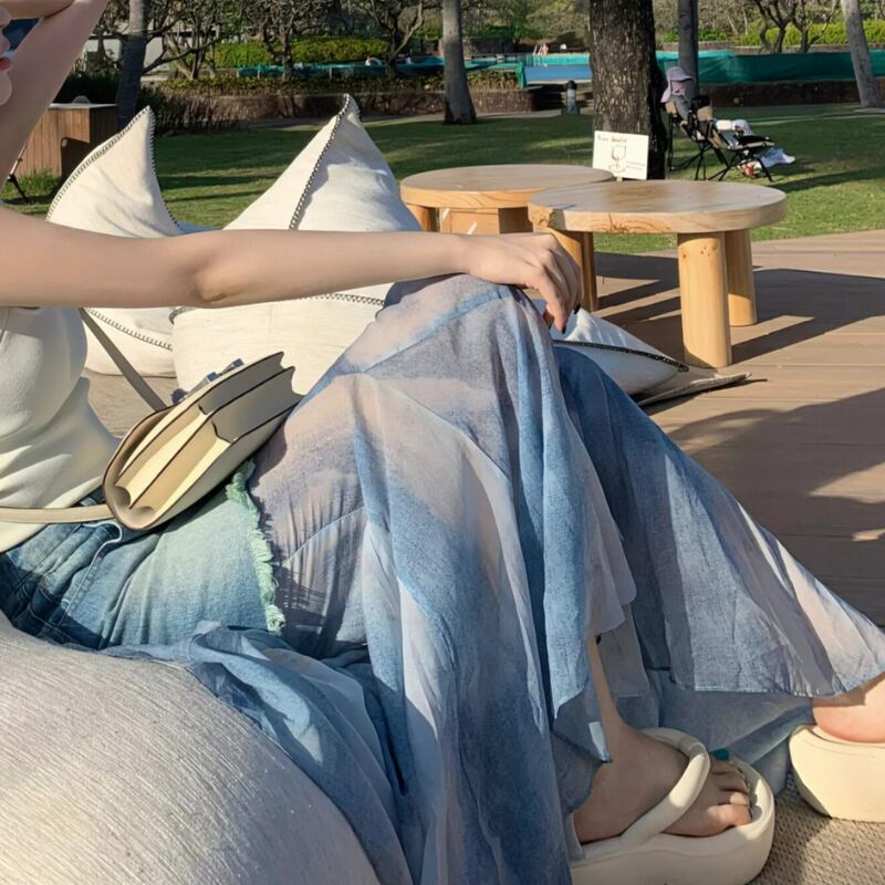 デニム素材のウエスト部分がしっかりとした印象を与えシアーなスカート部分が軽やかでエレガントな雰囲気をプラスします。