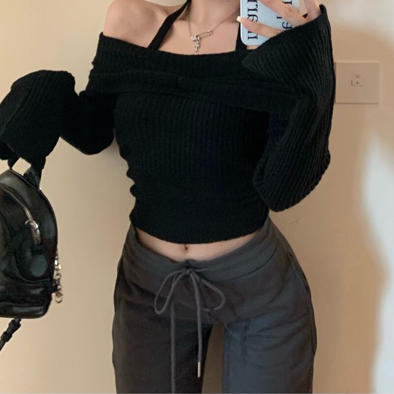 大胆なホルターネックデザインとオフショルダーが特徴のニットトップ。